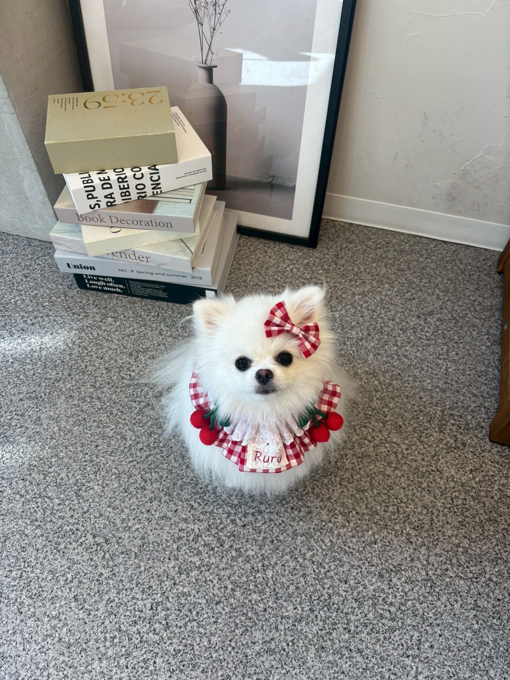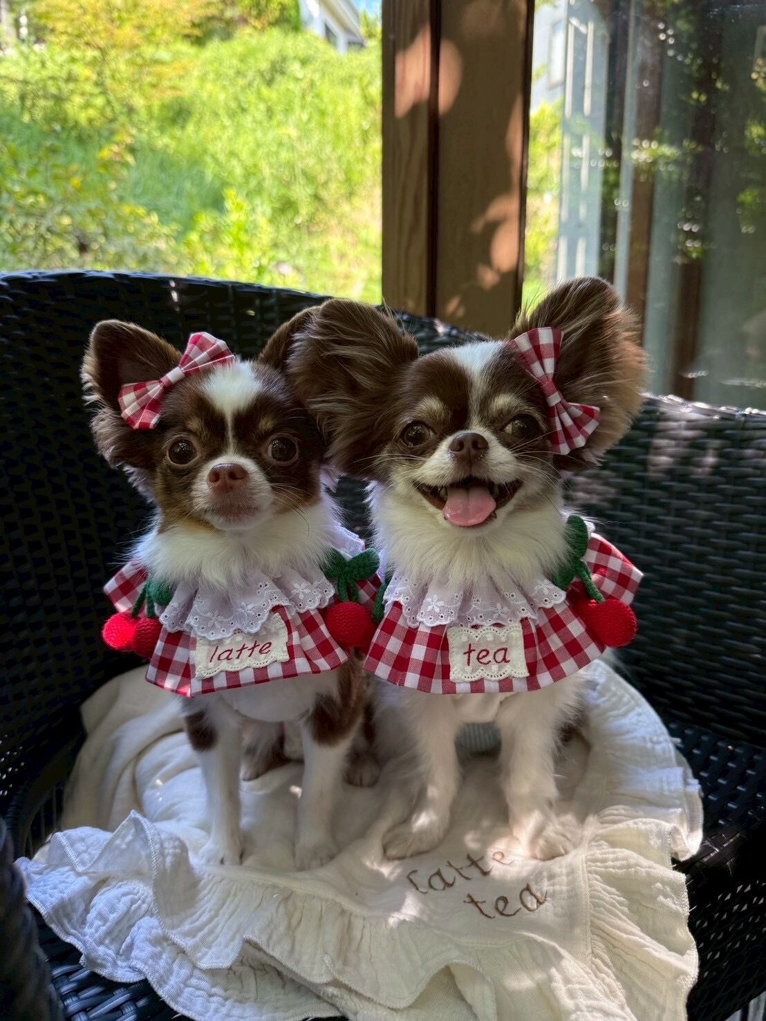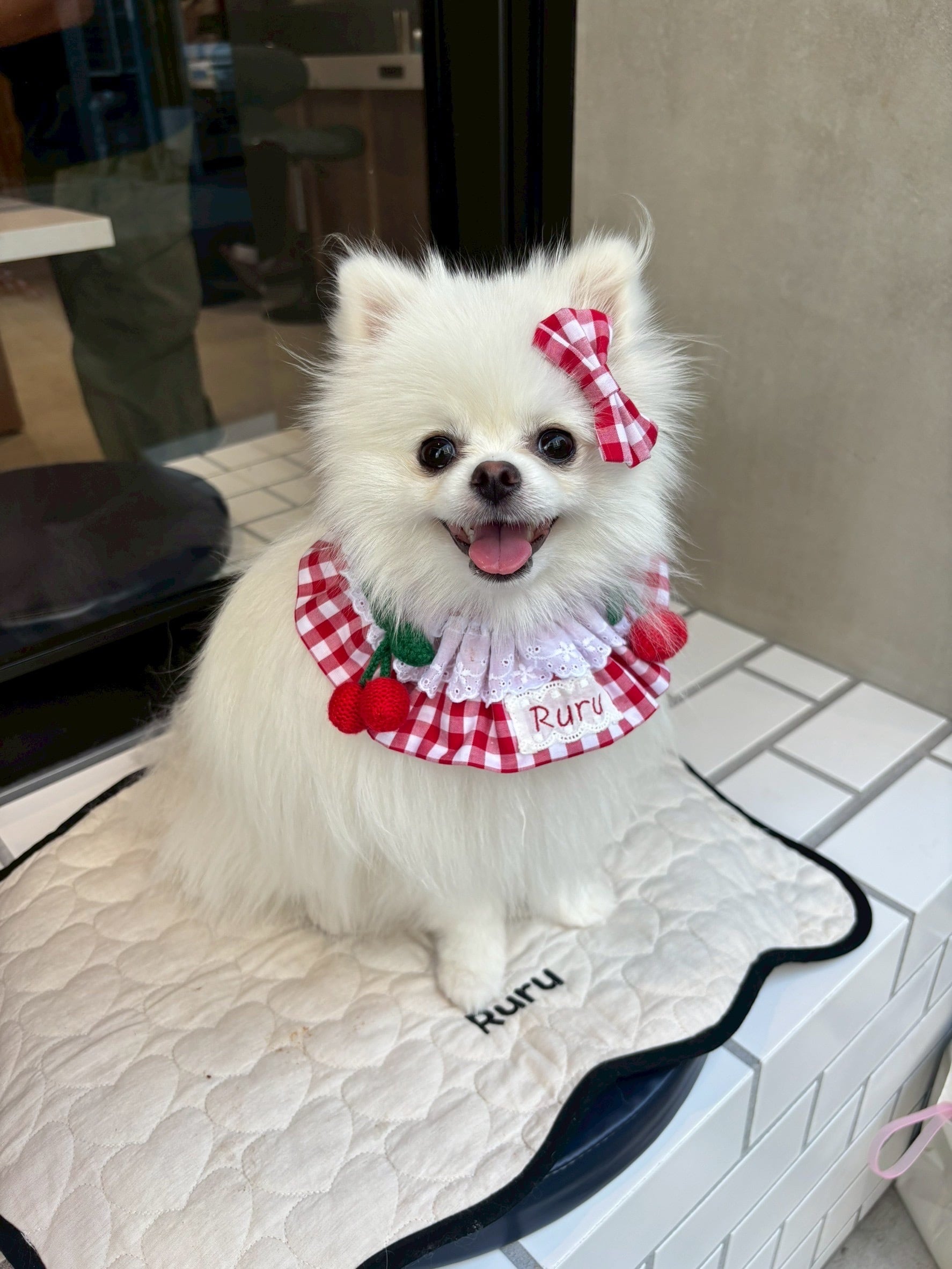 cherry gingham capeとおそろいのリボンアクセサリー。